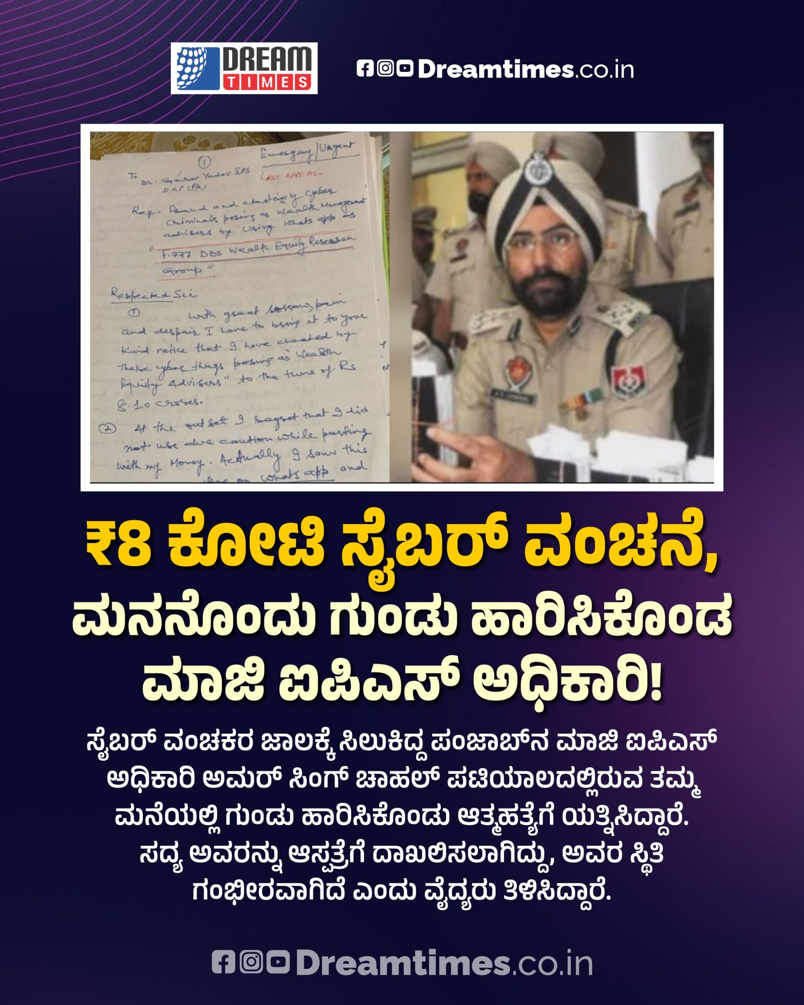 ಸೈಬರ್ ವಂಚಕರ ಜಾಲಕ್ಕೆ ಸಿಲುಕಿದ್ದ ಪಂಜಾಬ್ನ ಮಾಜಿ ಐಪಿಎಸ್ ಅಧಿಕಾರಿ ಅಮರ್ ಸಿಂಗ್ ಚಾಹಲ್ ಪಟಿಯಾಲದಲ್ಲಿರುವ ತಮ್ಮ ಮನೆಯಲ್ಲಿ ಗುಂಡು ಹಾರಿಸಿಕೊಂಡು ಆತ್ಮಹತ್ಯೆಗೆ ಯತ್ನಿಸಿದ್ದಾರೆ. ಸದ್ಯ ಅವರನ್ನು ಆಸ್ಪತ್ರೆಗೆ ದಾಖಲಿಸಲಾಗಿದ್ದು, ಅವರ ಸ್ಥಿತಿ ಗಂಭೀರವಾಗಿದೆ ಎಂದು ವೈದ್ಯರು ತಿಳಿಸಿದ್ದಾರೆ.