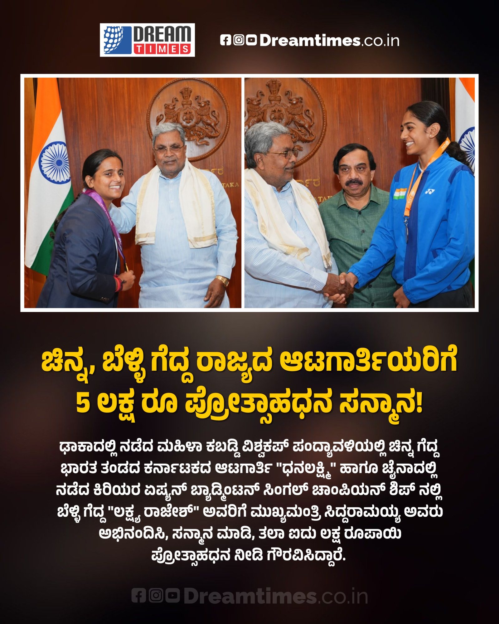 ಚಿನ್ನ ,ಬೆಳ್ಳಿ ಗೆದ್ದ ರಾಜ್ಯದ ಆಟಗಾರ್ತಿಯರಿಗೆ 5 ಲಕ್ಷ ರೂ ಪ್ರೋತ್ಸಾಹಧನ ಸನ್ಮಾನ!