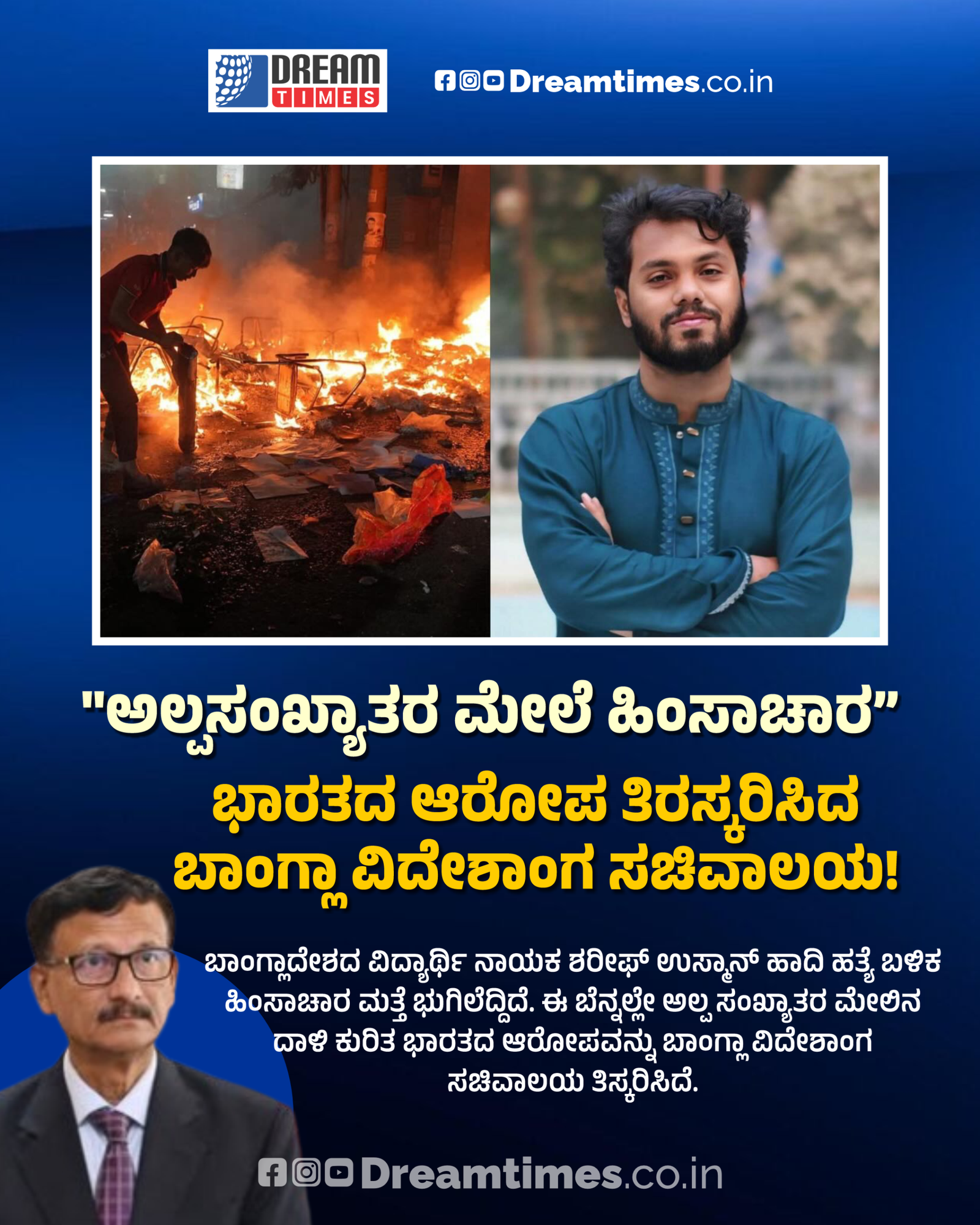 ಬಾಂಗ್ಲಾದೇಶದ ವಿದ್ಯಾರ್ಥಿ ನಾಯಕ ಶರೀಫ್ ಉಸ್ಮಾನ್ ಹಾದಿ ಹತ್ಯೆ ಬಳಿಕ ಹಿಂಸಾಚಾರ ಮತ್ತೆ ಭುಗಿಲೆದ್ದಿದೆ. ಈ ಬೆನ್ನಲ್ಲೇ ಅಲ್ಪ ಸಂಖ್ಯಾತರ ಮೇಲಿನ ದಾಳಿ ಕುರಿತ ಭಾರತದ ಆರೋಪವನ್ನು ಬಾಂಗ್ಲಾ ವಿದೇಶಾಂಗ ಸಚಿವಾಲಯ ತಿಸ್ಕರಿಸಿದೆ.
