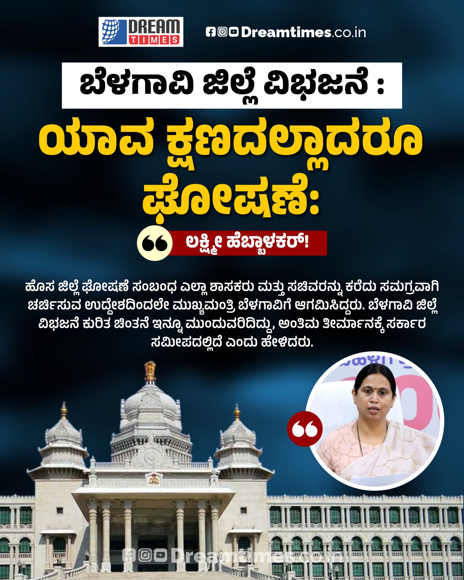 ಬೆಳಗಾವಿ ಜಿಲ್ಲೆ ವಿಭಜನೆ : ಯಾವ ಕ್ಷಣದಲ್ಲಾದರೂ ಘೋಷಣೆ: ಲಕ್ಷ್ಮೀ ಹೆಬ್ಬಾಳಕರ್!