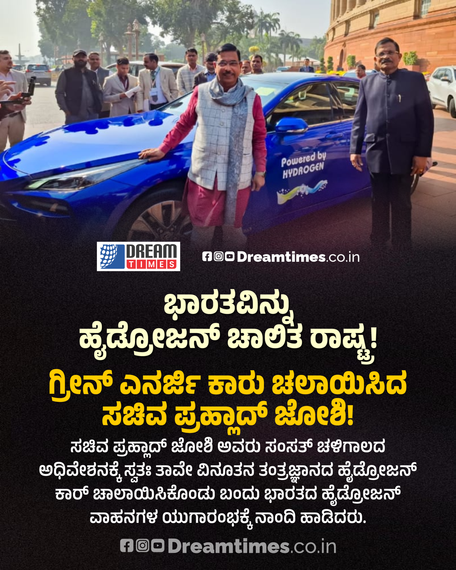 ಸಚಿವ ಪ್ರಹ್ಲಾದ್ ಜೋಶಿ ಅವರು ಸಂಸತ್ ಚಳಿಗಾಲದ ಅಧಿವೇಶನಕ್ಕೆ ಸ್ವತಃ ತಾವೇ ವಿನೂತನ ತಂತ್ರಜ್ಞಾನದ ಹೈಡ್ರೋಜನ್ ಕಾರ್ ಚಾಲಾಯಿಸಿಕೊಂಡು ಬಂದು ಭಾರತದ ಹೈಡ್ರೋಜನ್ ವಾಹನಗಳ ಯುಗಾರಂಭಕ್ಕೆ ನಾಂದಿ ಹಾಡಿದರು.