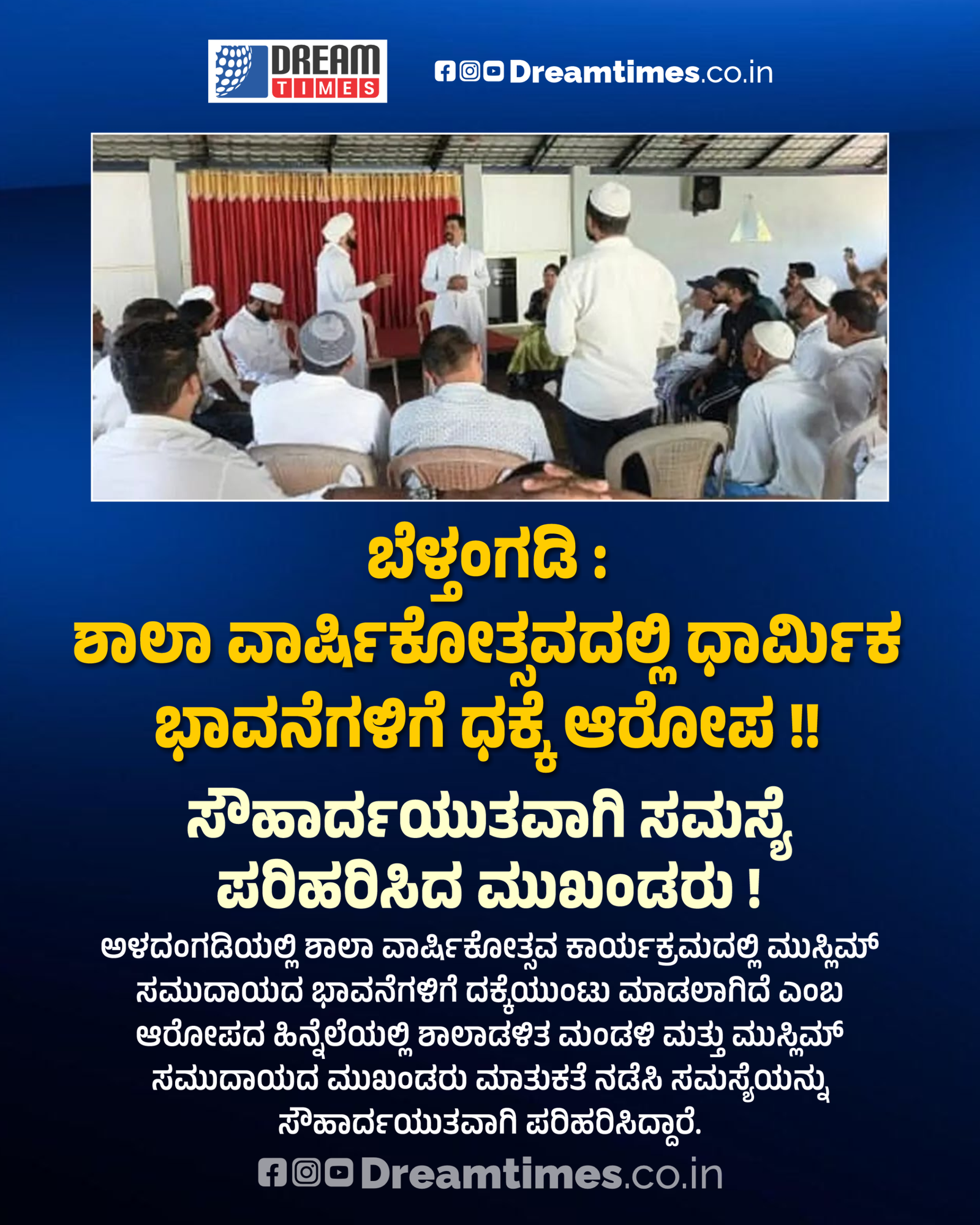ಅಳದಂಗಡಿಯಲ್ಲಿ ಶಾಲಾ ವಾರ್ಷಿಕೋತ್ಸವ ಕಾರ್ಯಕ್ರಮದಲ್ಲಿ ಮುಸ್ಲಿಮ್ ಸಮುದಾಯದ ಭಾವನೆಗಳಿಗೆ ದಕ್ಕೆಯುಂಟು ಮಾಡಲಾಗಿದೆ ಎಂಬ ಆರೋಪದ ಹಿನ್ನೆಲೆಯಲ್ಲಿ ಶಾಲಾಡಳಿತ ಮಂಡಳಿ ಮತ್ತು ಮುಸ್ಲಿಮ್ ಸಮುದಾಯದ ಮುಖಂಡರು ಮಾತುಕತೆ ನಡೆಸಿ ಸಮಸ್ಯೆಯನ್ನು ಸೌಹಾರ್ದಯುತವಾಗಿ ಪರಿಹರಿಸಿದ್ದಾರೆ.