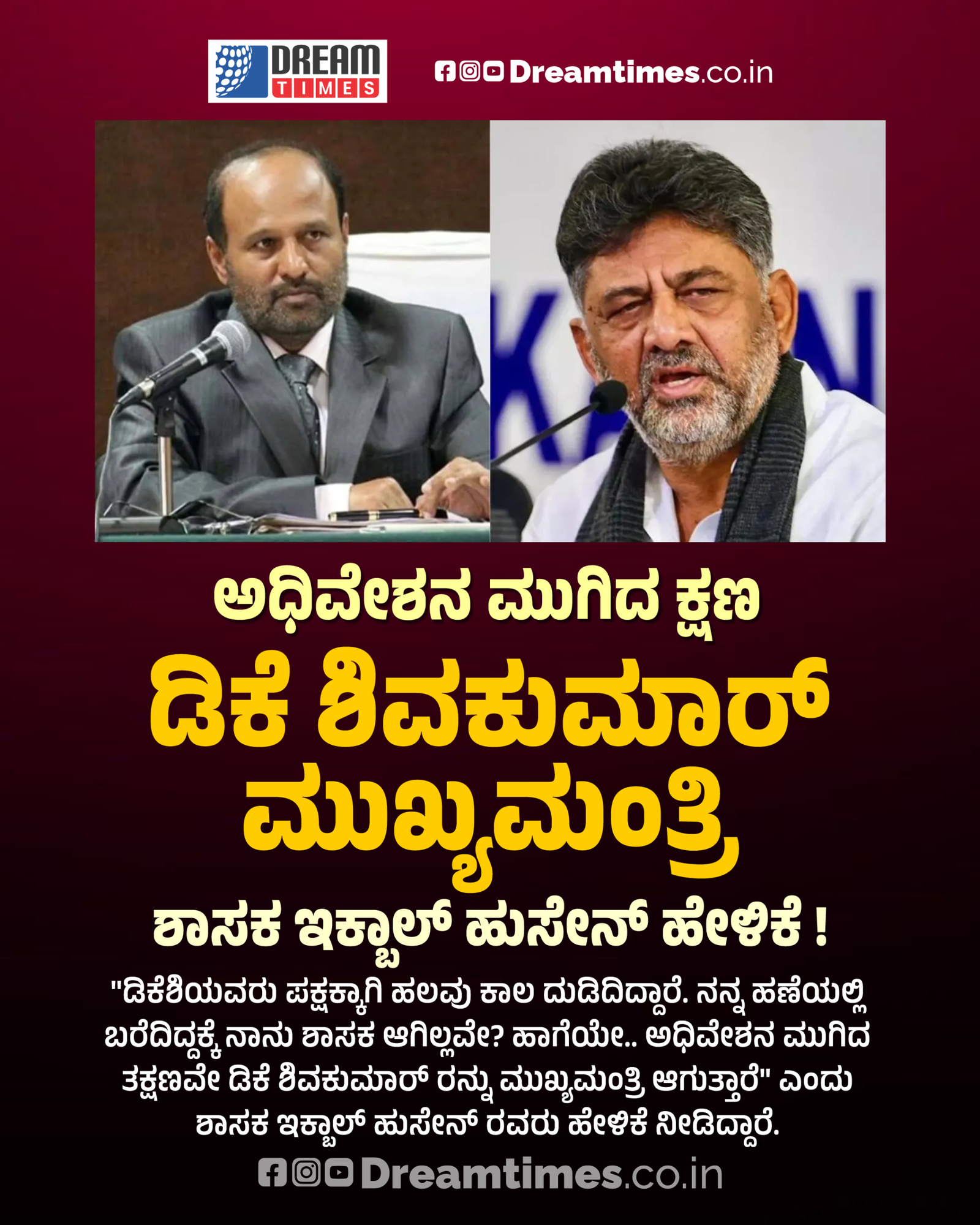“ಡಿಕೆಶಿಯವರು ಪಕ್ಷಕ್ಕಾಗಿ ಹಲವು ಕಾಲ ದುಡಿದಿದ್ದಾರೆ. ನನ್ನ ಹಣೆಯಲ್ಲಿ ಬರೆದಿದ್ದಕ್ಕೆ ನಾನು ಶಾಸಕ ಆಗಿಲ್ಲವೇ ? ಹಾಗೆಯೇ.. ಅಧಿವೇಶನ ಮುಗಿದ ತಕ್ಷಣವೇ ಡಿಕೆ ಶಿವಕುಮಾರ್ ರನ್ನು ಮುಖ್ಯಮಂತ್ರಿ ಆಗುತ್ತಾರೆ” ಎಂದು ಶಾಸಕ ಇಕ್ಬಾಲ್ ಹುಸೇನ್ ರವರು ಹೇಳಿಕೆ ನೀಡಿದ್ದಾರೆ.