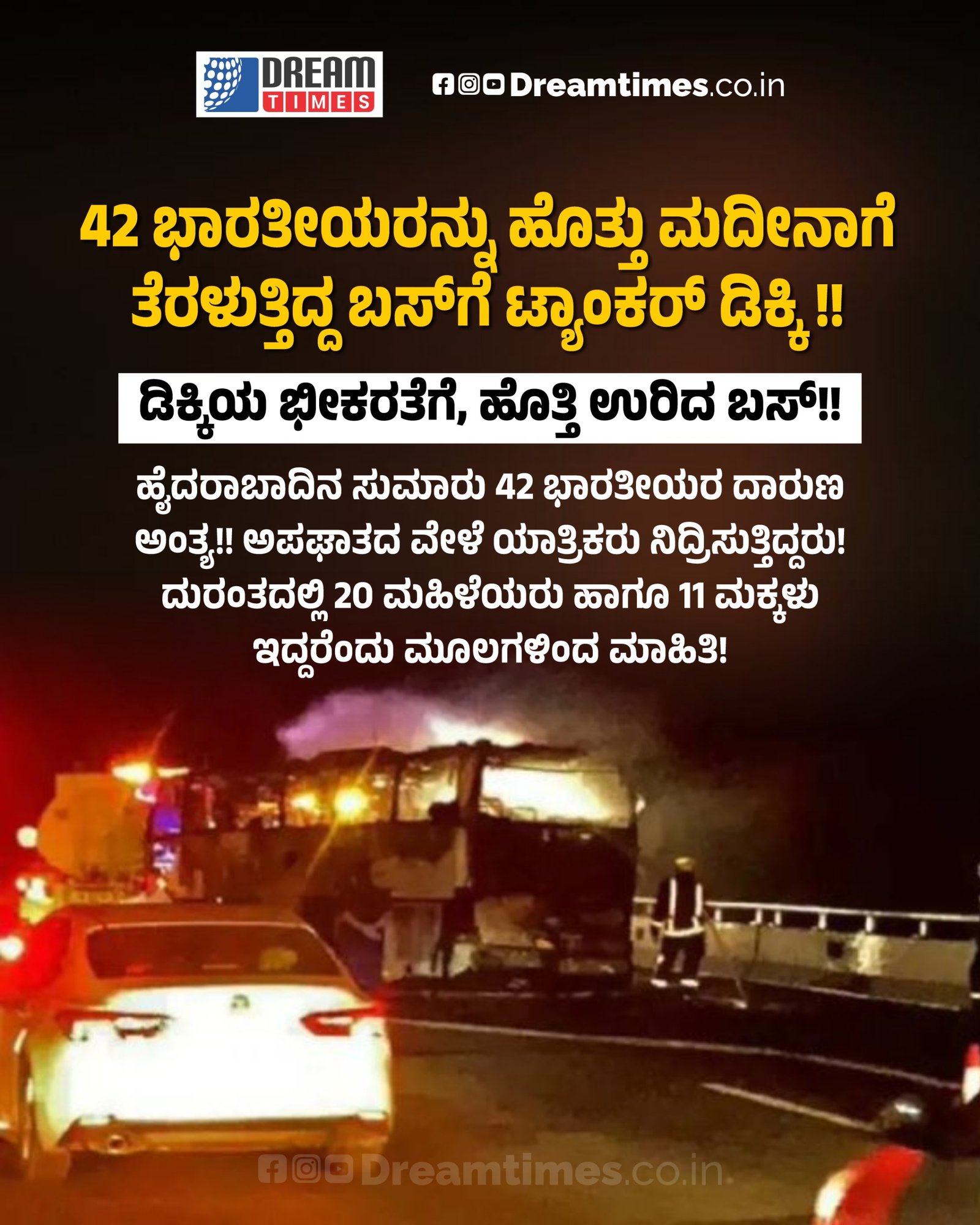 42 ಭಾರತೀಯರನ್ನು ಹೊತ್ತು ಮದೀನಾಗೆ ತೆರಳುತ್ತಿದ್ದ ಬಸ್ಗೆ ಟ್ಯಾಂಕರ್ ಡಿಕ್ಕಿ !!ಡಿಕ್ಕಿಯ ಭೀಕರತೆಗೆ ,ಹೊತ್ತಿ ಉರಿದ ಬಸ್!!