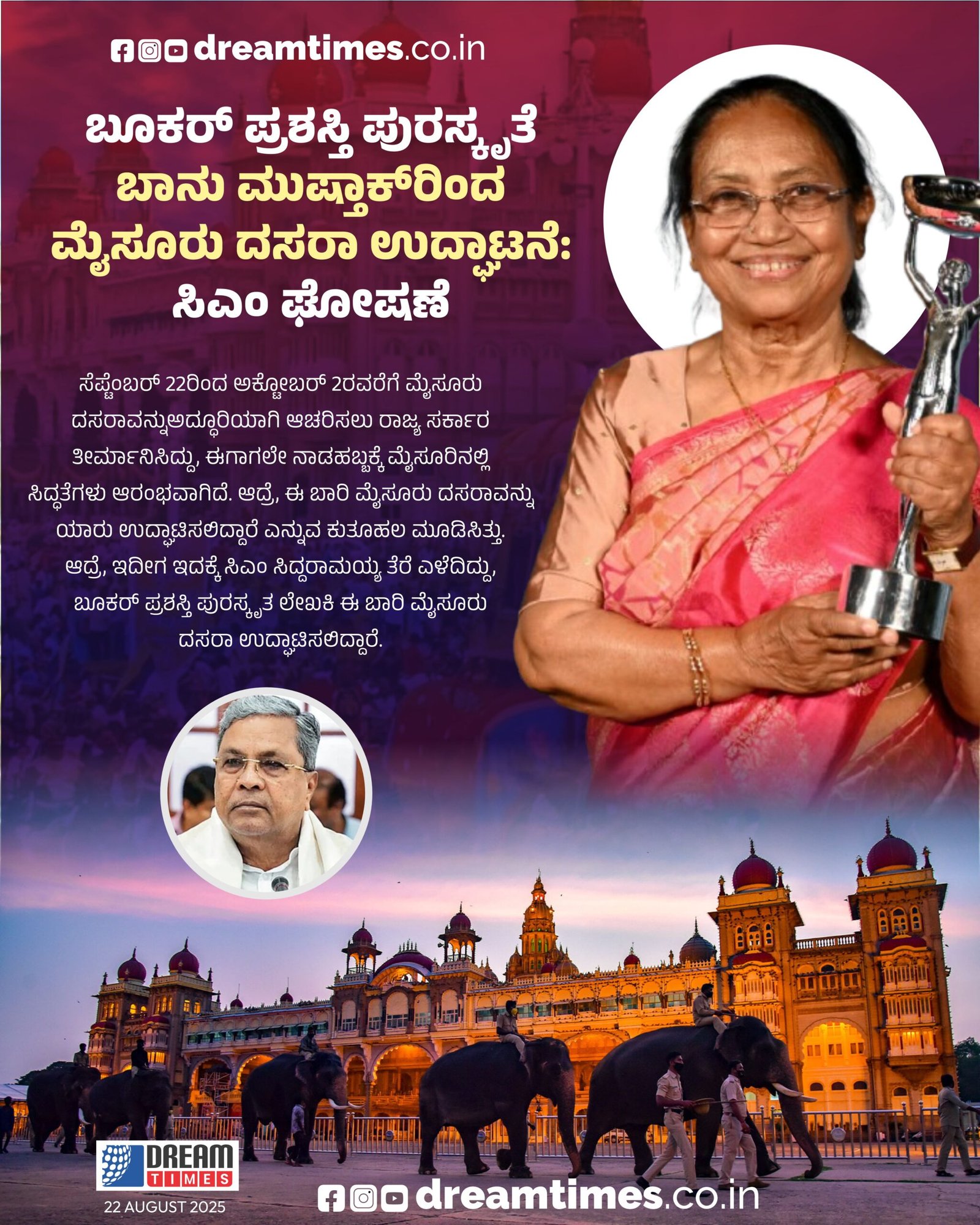 ಬೂಕರ್ ಪ್ರಶಸ್ತಿ ಪುರಸ್ಕೃತೆ ಬಾನು ಮುಷ್ತಾಕ್ರಿಂದ ಮೈಸೂರು ದಸರಾ ಉದ್ಘಾಟನೆ: ಸಿಎಂ ಘೋಷಣೆ
