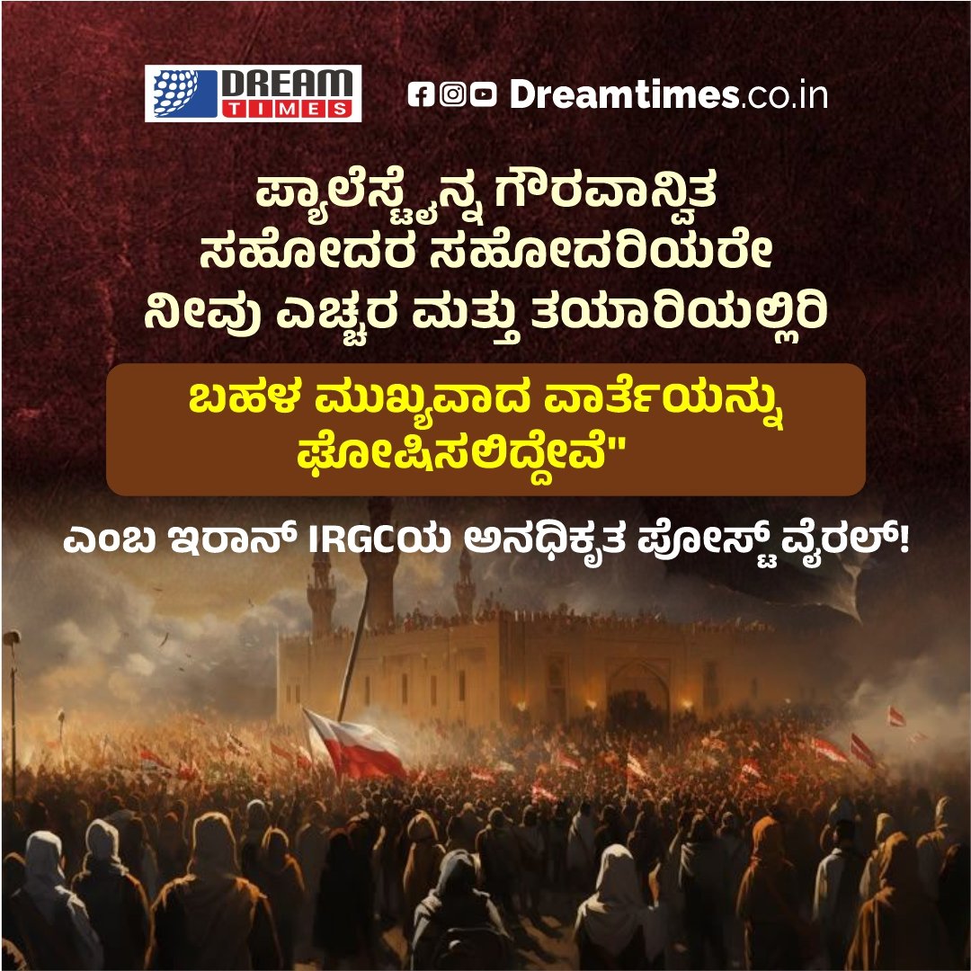 ಪ್ಯಾಲೆಸ್ಟೈನ್ನ ಗೌರವಾನ್ವಿತ ಸಹೋದರ ಸಹೋದರಿಯರೇ ನೀವು ಎಚ್ಚರ ಮತ್ತು ತಯಾರಿಯಲ್ಲಿರಿ …, ಬಹಳ ಮುಖ್ಯವಾದ ವಾರ್ತೆಯನ್ನು ಘೋಷಿಸಲಿದ್ದೇವೆ” ಎಂಬ ಇರಾನ್ IRGCಯ ಅನಧಿಕೃತ ಪೋಸ್ಟ್ ವೈರಲ್!