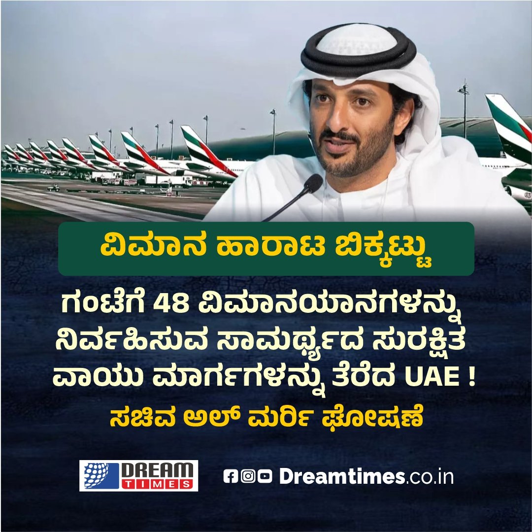 ವಿಮಾನ ಹಾರಾಟ ಬಿಕ್ಕಟ್ಟು ಗಂಟೆಗೆ 48 ವಿಮಾನಯಾನಗಳನ್ನು ನಿರ್ವಹಿಸುವ ಸಾಮರ್ಥ್ಯದ ಸುರಕ್ಷಿತ ವಾಯು ಮಾರ್ಗಗಳನ್ನು ತೆರೆದ UAE ! ಸಚಿವ ಅಲ್ ಮರ್ರಿ ಘೋಷಣೆ