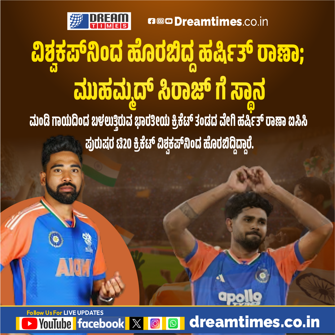 ವಿಶ್ವಕಪ್ನಿಂದ ಹೊರಬಿದ್ದ ಹರ್ಷಿತ್ ರಾಣಾ; ಮುಹಮ್ಮದ್ ಸಿರಾಜ್ ಗೆ ಸ್ಥಾನ