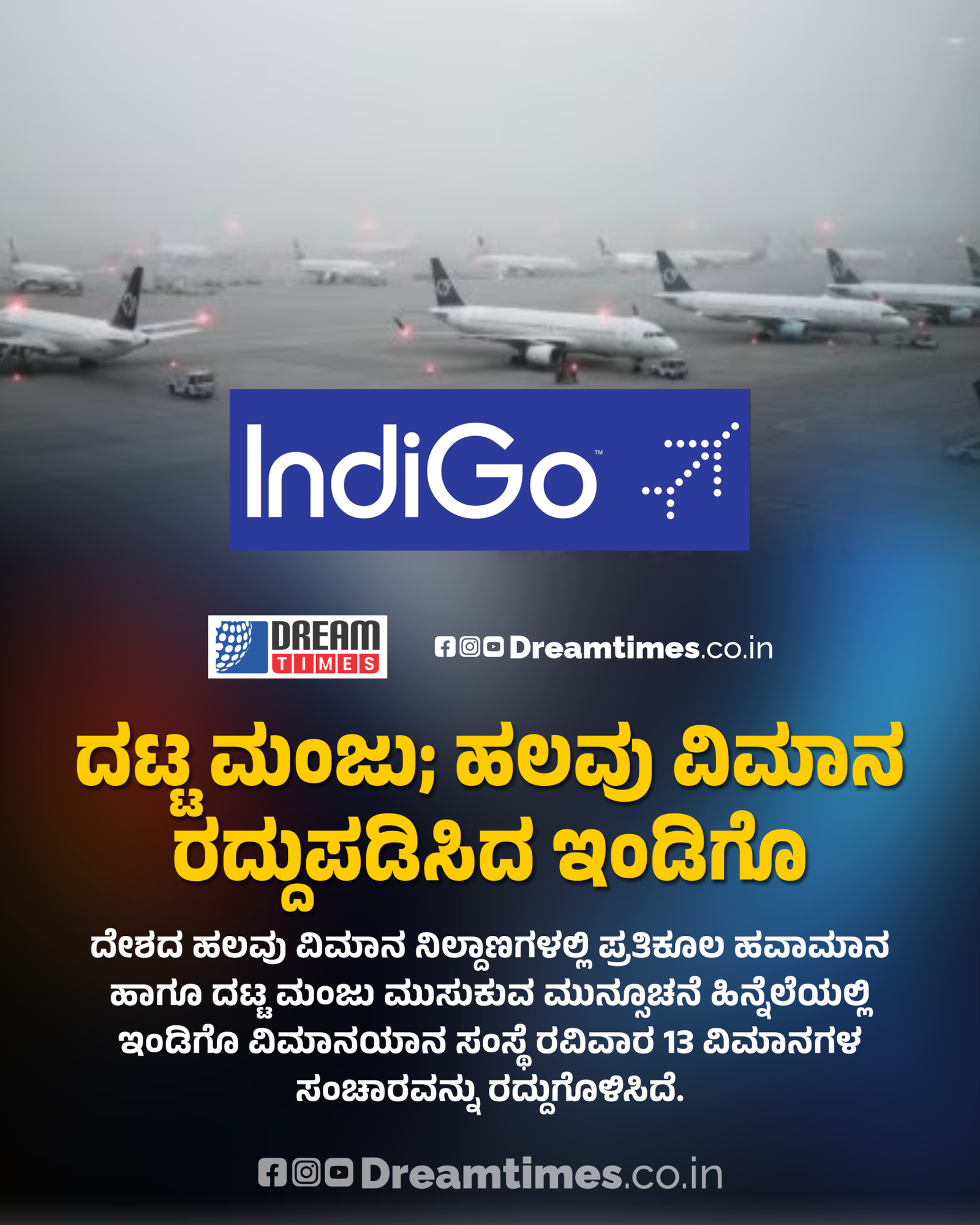 ದೇಶದ ಹಲವು ವಿಮಾನ ನಿಲ್ದಾಣಗಳಲ್ಲಿ ಪ್ರತಿಕೂಲ ಹವಾಮಾನ ಹಾಗೂ ದಟ್ಟ ಮಂಜು ಮುಸುಕುವ ಮುನ್ಸೂಚನೆ ಹಿನ್ನೆಲೆಯಲ್ಲಿ ಇಂಡಿಗೊ ವಿಮಾನಯಾನ ಸಂಸ್ಥೆ ರವಿವಾರ 13 ವಿಮಾನಗಳ ಸಂಚಾರವನ್ನು ರದ್ದುಗೊಳಿಸಿದೆ.
