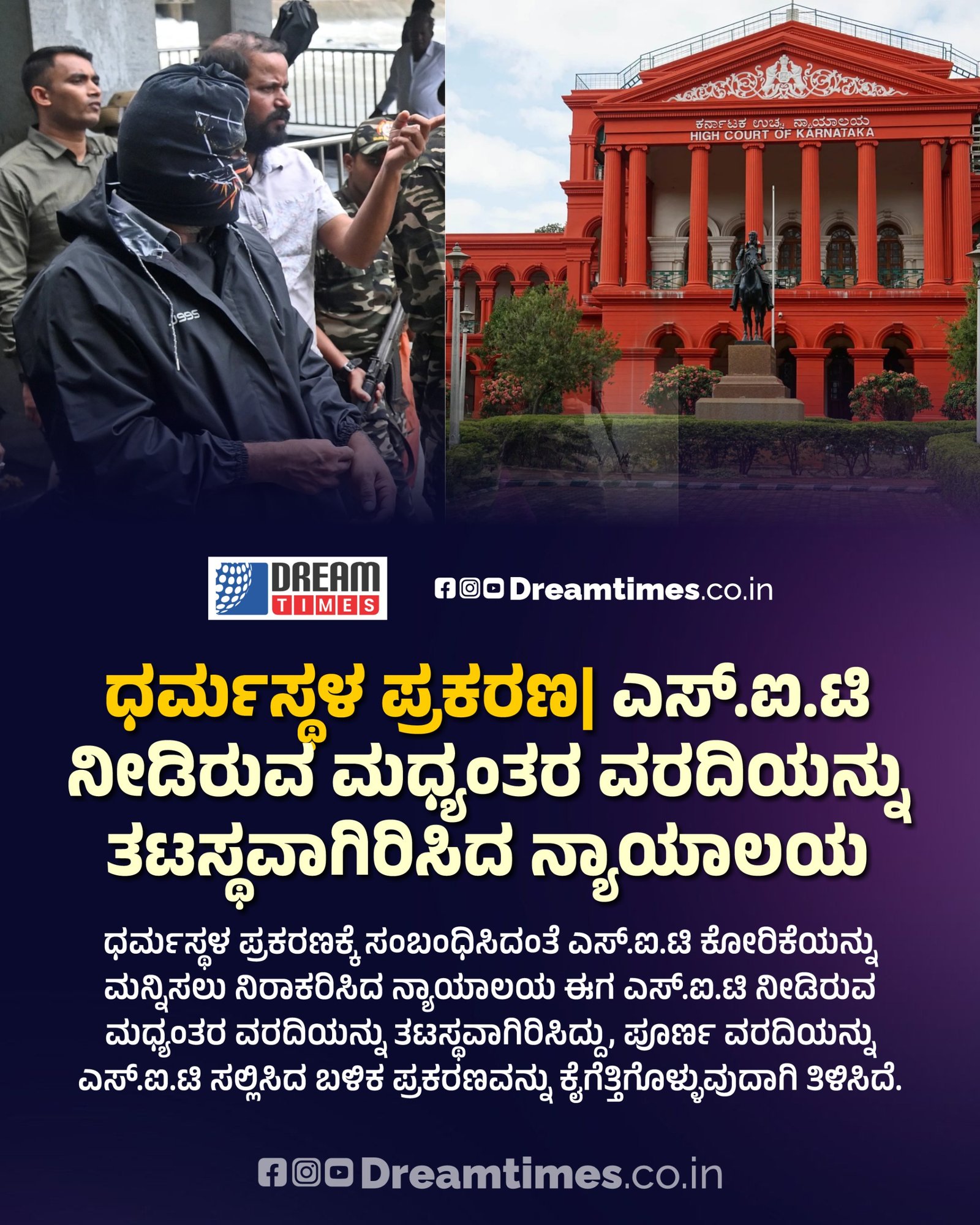 ಬೆಂಗಳೂರು: ಧರ್ಮಸ್ಥಳ ಪ್ರಕರಣಕ್ಕೆ ಸಂಬಂಧಿಸಿದಂತೆ ಎಸ್.ಐ.ಟಿ ಕೋರಿಕೆಯನ್ನು ಮನ್ನಿಸಲು ನಿರಾಕರಿಸಿದ ನ್ಯಾಯಾಲಯ ಈಗ ಎಸ್.ಐ.ಟಿ ನೀಡಿರುವ ಮಧ್ಯಂತರ ವರದಿಯನ್ನು ತಟಸ್ಥವಾಗಿರಿಸಿದ್ದು, ಪೂರ್ಣ ವರದಿಯನ್ನು ಎಸ್.ಐ.ಟಿ ಸಲ್ಲಿಸಿದ ಬಳಿಕ ಪ್ರಕರಣವನ್ನು ಕೈಗೆತ್ತಿಗೊಳ್ಳುವುದಾಗಿ ತಿಳಿಸಿದೆ.