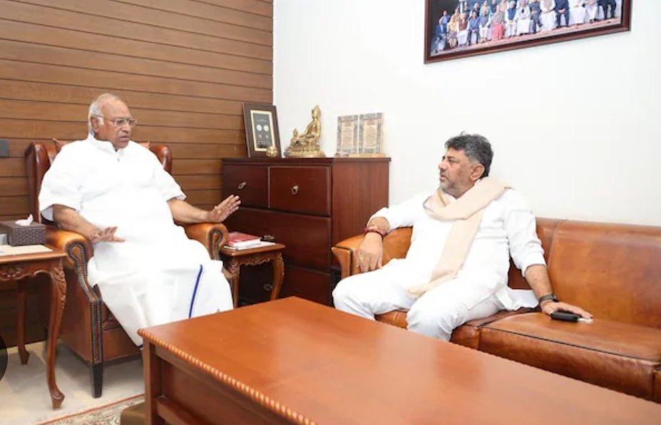ನವದೆಹಲಿ ನವೆಂಬರ್ 17: ಉಪಮುಖ್ಯಮಂತ್ರಿ ಡಿಕೆ ಶಿವಕುಮಾರ್ ಅವರು ಭಾನುವಾರ ಕಾಂಗ್ರೆಸ್ ಅಧ್ಯಕ್ಷ ಮಲ್ಲಿಕಾರ್ಜುನ ಖರ್ಗೆ ಅವರನ್ನು ಭೇಟಿ ಮಾಡಿ ರಾಜ್ಯದಲ್ಲಿ ನಾಯಕತ್ವ ಬದಲಾವಣೆಯ ವಿಷಯವನ್ನು ಪ್ರಸ್ತಾಪಿಸಿದ್ದಾರೆ ಎಂದು ತಿಳಿದುಬಂದಿದೆ. ಶಿವಕುಮಾರ್ ಅವರು ತಮ್ಮ ಸಹೋದರ ಡಿಕೆ ಸುರೇಶ್ ಅವರೊಂದಿಗೆ ಹಿರಿಯ ನಾಯಕನನ್ನು ಅವರ ನಿವಾಸದಲ್ಲಿ ಭೇಟಿಯಾದರು. ಸಭೆಯ ನಂತರ ಶಿವಕುಮಾರ್ ಮಾಧ್ಯಮಗಳೊಂದಿಗೆ ಮಾತನಾಡಲು ನಿರಾಕರಿಸಿದರೂ, ಒಕ್ಕಲಿಗ ನಾಯಕ ನಾಯಕತ್ವ ಬದಲಾವಣೆಯ ವಿಷಯವನ್ನು ಎತ್ತಿದ್ದಾರೆ ಎಂದು ಮೂಲಗಳು ಡಿಎಚ್‌ಗೆ ತಿಳಿಸಿವೆ.
