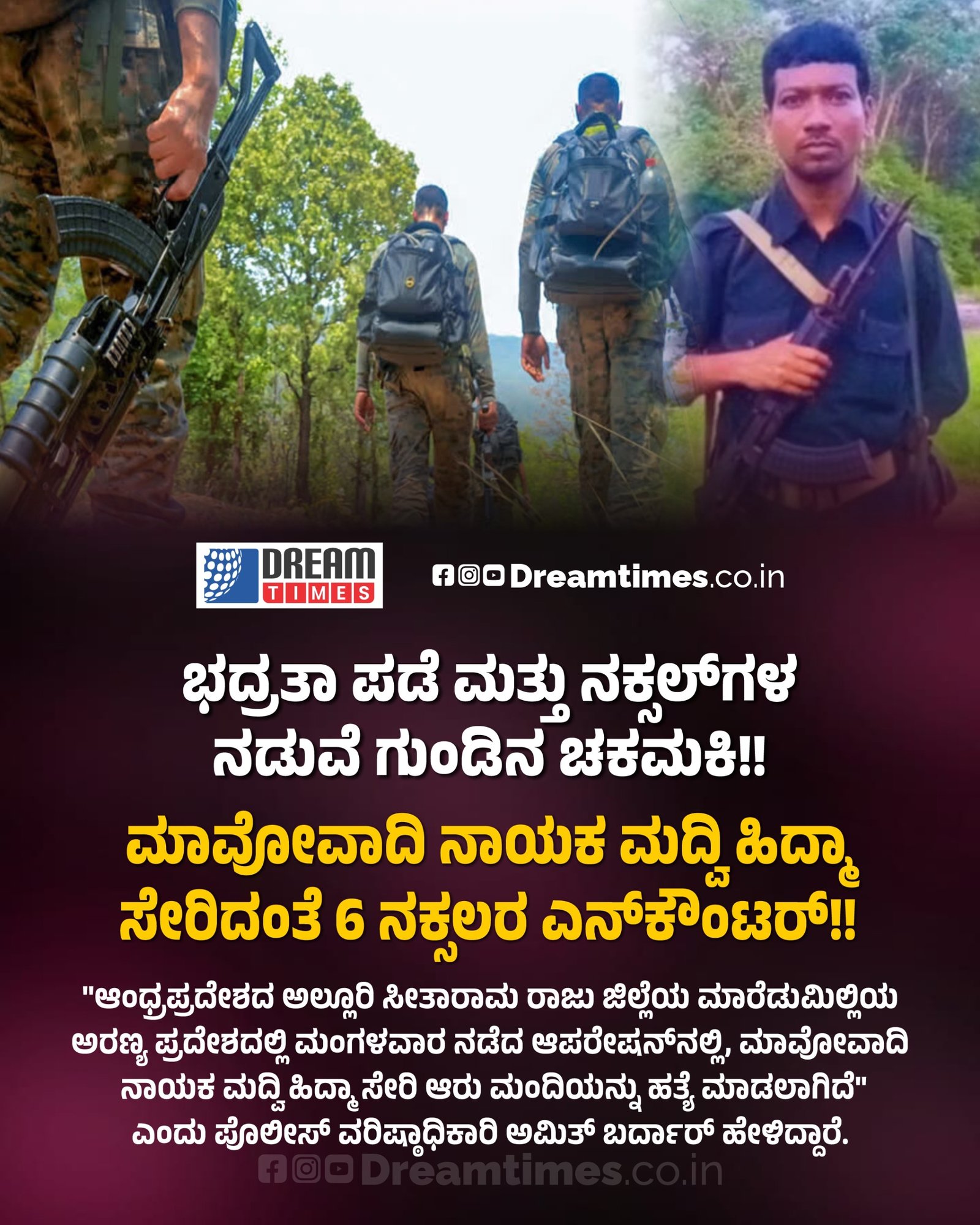 “ಆಂಧ್ರಪ್ರದೇಶದ ಅಲ್ಲೂರಿ ಸೀತಾರಾಮ ರಾಜು ಜಿಲ್ಲೆಯ ಮಾರೆಡುಮಿಲ್ಲಿಯ‌ ಅರಣ್ಯ ಪ್ರದೇಶದಲ್ಲಿ ಮಂಗಳವಾರ ನಡೆದ ಆಪರೇಷನ್‌ನಲ್ಲಿ ,ಮಾವೋವಾದಿ ನಾಯಕ ಮದ್ವಿ ಹಿದ್ಮಾ ಸೇರಿ ಆರು ಮಂದಿಯನ್ನು ಹತ್ಯೆ ಮಾಡಲಾಗಿದೆ” ಎಂದು ಪೊಲೀಸ್ ವರಿಷ್ಠಾಧಿಕಾರಿ ಅಮಿತ್ ಬರ್ದಾರ್ ಹೇಳಿದ್ದಾರೆ.