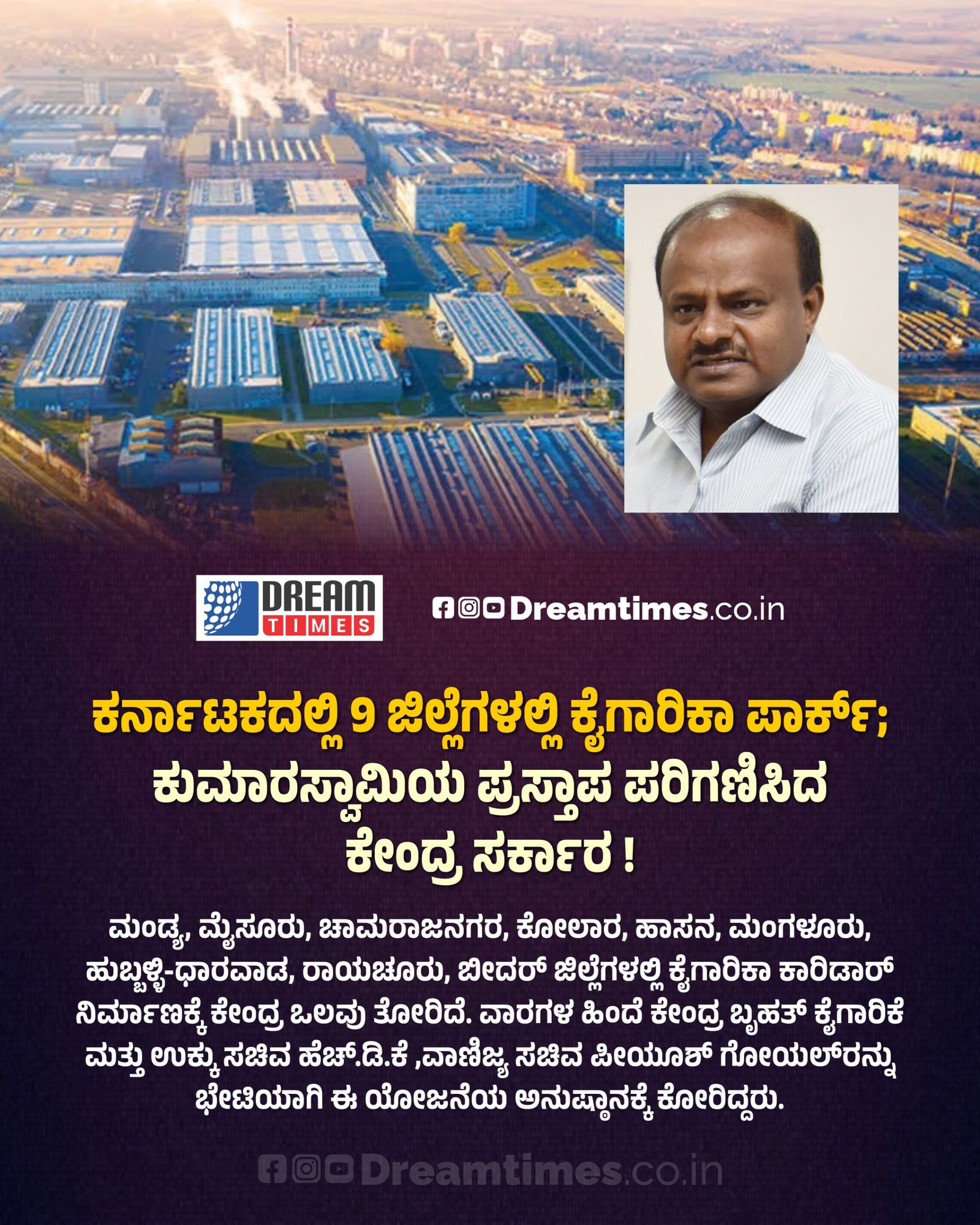 ಕರ್ನಾಟಕದಲ್ಲಿ 9 ಜಿಲ್ಲೆಗಳಲ್ಲಿ ಕೈಗಾರಿಕಾ ಪಾರ್ಕ್; ಕುಮಾರಸ್ವಾಮಿಯ ಪ್ರಸ್ತಾಪ ಪರಿಗಣಿಸಿದ ಕೇಂದ್ರ ಸರ್ಕಾರ !
