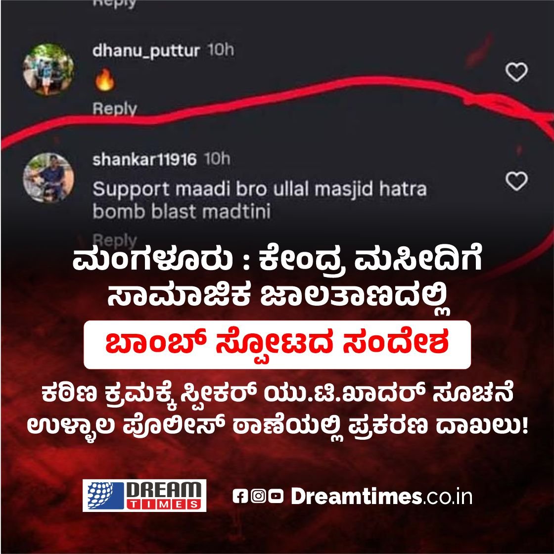 ಮಂಗಳೂರು : ಕೇಂದ್ರ ಮಸೀದಿಗೆ ಸಾಮಾಜಿಕ ಜಾಲತಾಣದಲ್ಲಿ ಬಾಂಬ್ ಸ್ಪೋಟದ ಸಂದೇಶ ಕಠಿಣ ಕ್ರಮಕ್ಕೆ ಸ್ಪೀಕರ್ ಯು.ಟಿ.ಖಾದರ್ ಸೂಚನೆ ಉಳ್ಳಾಲ ಪೊಲೀಸ್ ಠಾಣೆಯಲ್ಲಿ ಪ್ರಕರಣ ದಾಖಲು!