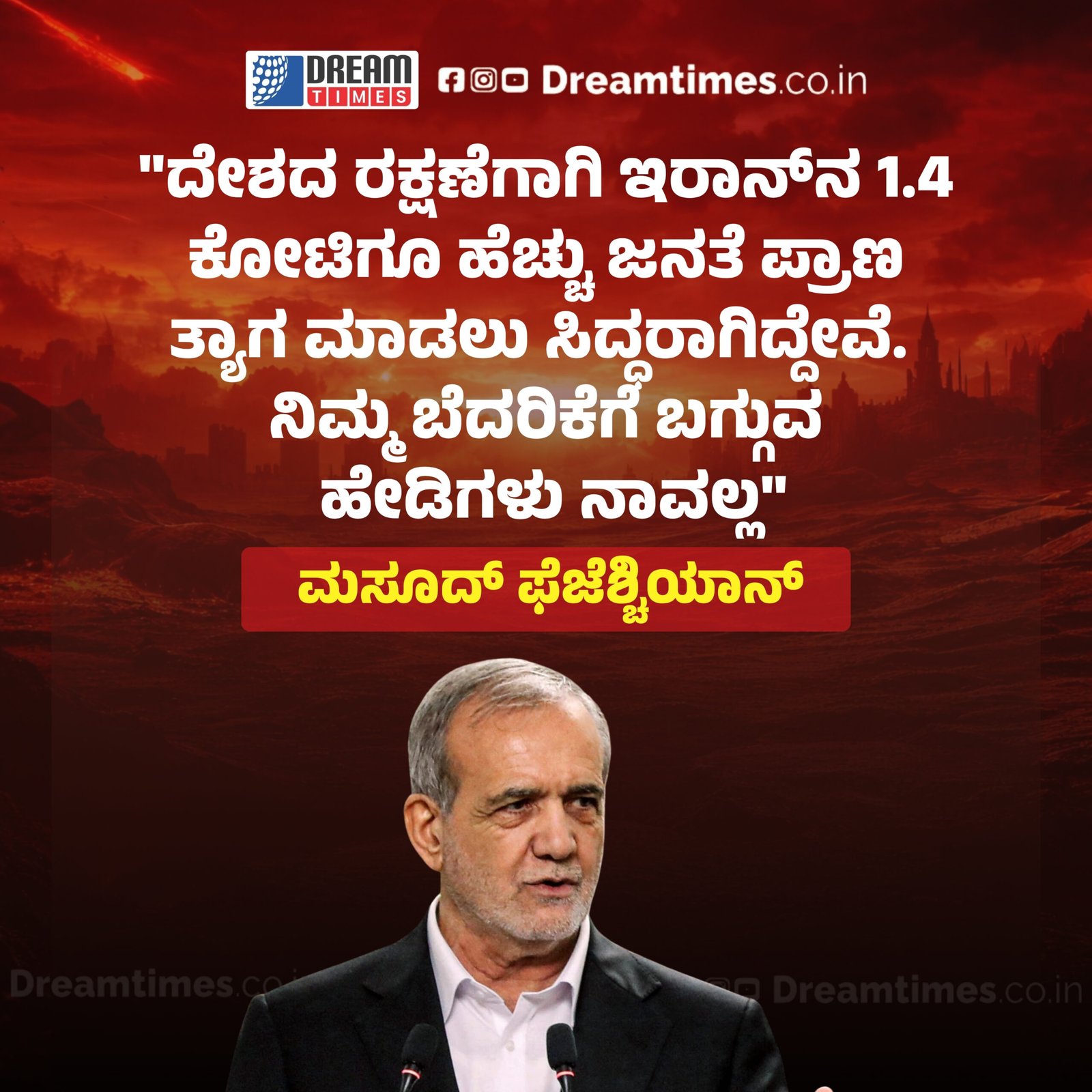 “ದೇಶದ ರಕ್ಷಣೆಗಾಗಿ ಇರಾನ್‌ನ 1.4 ಕೋಟಿಗೂ ಹೆಚ್ಚು ಜನತೆ ಪ್ರಾಣ ತ್ಯಾಗ ಮಾಡಲು ಸಿದ್ಧರಾಗಿದ್ದೇವೆ. ನಿಮ್ಮ ಬೆದರಿಕೆಗೆ ಬಗ್ಗುವ ಹೇಡಿಗಳು ನಾವಲ್ಲ” ಮಸೂದ್ ಫೆಜೆಶ್ಚಿಯಾನ್