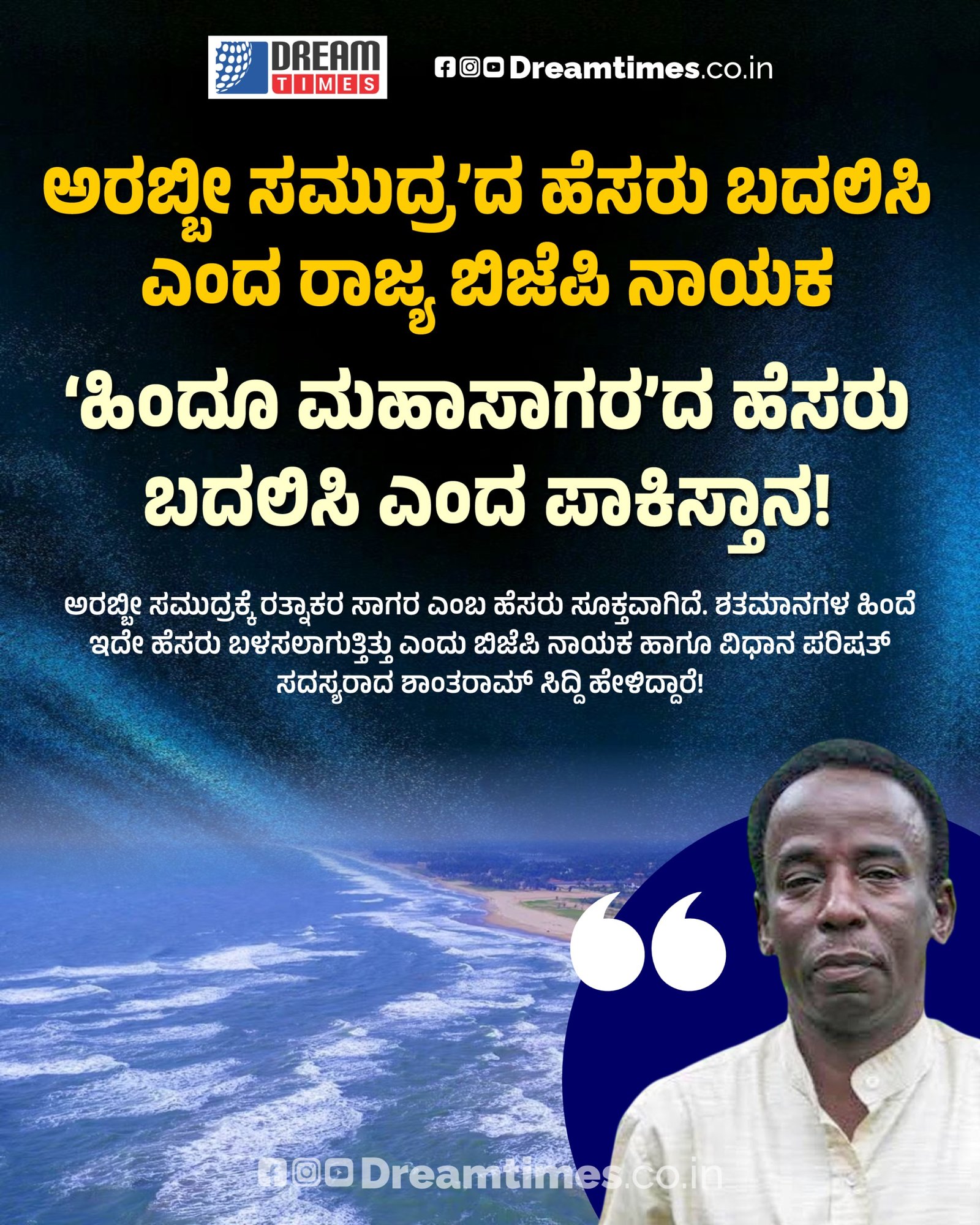 ಅರಬ್ಬೀ ಸಮುದ್ರಕ್ಕೆ ರತ್ನಾಕರ ಸಾಗರ ಎಂಬ ಹೆಸರು ಸೂಕ್ತವಾಗಿದೆ. ಶತಮಾನಗಳ ಹಿಂದೆ ಇದೇ ಹೆಸರು ಬಳಸಲಾಗುತ್ತಿತ್ತು ಎಂದು ಬಿಜೆಪಿ ನಾಯಕ ಹಾಗೂ ವಿಧಾನ ಪರಿಷತ್ ಸದಸ್ಯರಾದ ಶಾಂತರಾಮ್ ಸಿದ್ದಿ ಹೇಳಿದ್ದಾರೆ!