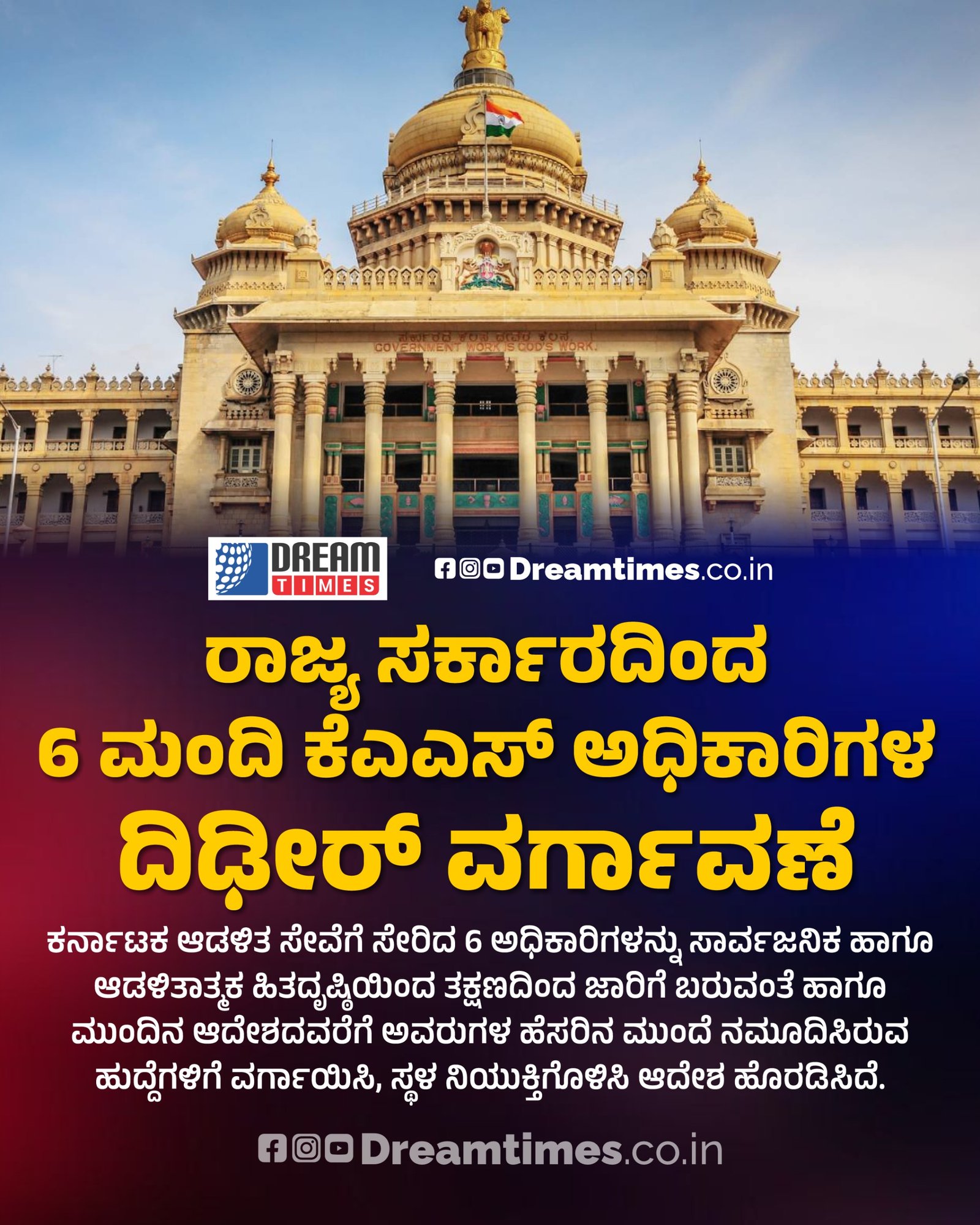 ರಾಜ್ಯ ಸರ್ಕಾರದಿಂದ 6 ಮಂದಿ ಕೆಎಎಸ್ ಅಧಿಕಾರಿಗಳ ದಿಢೀರ್ ವರ್ಗಾವಣೆ