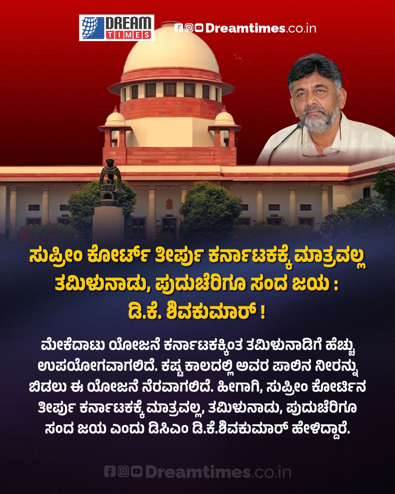 ಸುಪ್ರೀಂ ಕೋರ್ಟ್ ತೀರ್ಪು ಕರ್ನಾಟಕಕ್ಕೆ ಮಾತ್ರವಲ್ಲ ತಮಿಳುನಾಡು, ಪುದುಚೆರಿಗೂ ಸಂದ ಜಯ : ಡಿ.ಕೆ.ಶಿವಕುಮಾರ್ !