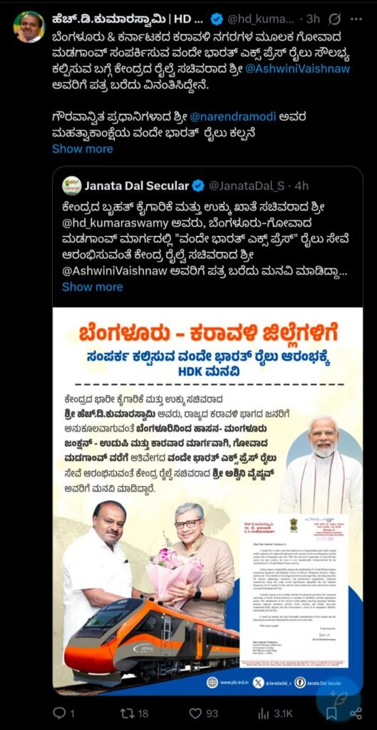 ಈ ಬಗ್ಗೆ ತಮ್ಮ ಎಕ್ಸ್ ಖಾತೆಯಲ್ಲಿಯೂ ಮಾಹಿತಿ ಹಂಚಿಕೊಂಡಿರುವ ಕುಮಾರಸ್ವಾಮಿ, ಪ್ರಧಾನಿ ನರೇಂದ್ರ ಮೋದಿಯವರ ಮಹತ್ವಾಕಾಂಕ್ಷೆಯ ವಂದೇ ಭಾರತ್ ರೈಲು ಕಲ್ಪನೆ ಭಾರತೀಯ ರೈಲ್ವೆಯಲ್ಲಿ ಪರಿವರ್ತನಾತ್ಮಕ ಕ್ರಾಂತಿಯನ್ನೇ ಉಂಟು ಮಾಡಿದೆ. ಬೆಂಗಳೂರು ಮತ್ತು ನಡುವಿನ ವಂದೇ ಭಾರತ್ ರೈಲು ರಾಜ್ಯಕ್ಕೆ, ಅದರಲ್ಲಿಯೂ ಕರಾವಳಿ ಭಾಗಕ್ಕೆ ದೊಡ್ಡ ಶಕ್ತಿಯಾಗಲಿದೆ ಎಂಬುದು ನನ್ನ ವಿಶ್ವಾಸ ಎಂದಿದ್ದಾರೆ.